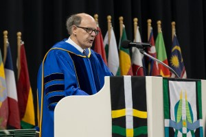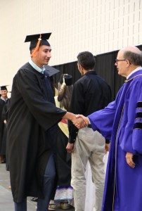George congratulates graduating student at Fond du Lac Tribal & Community College