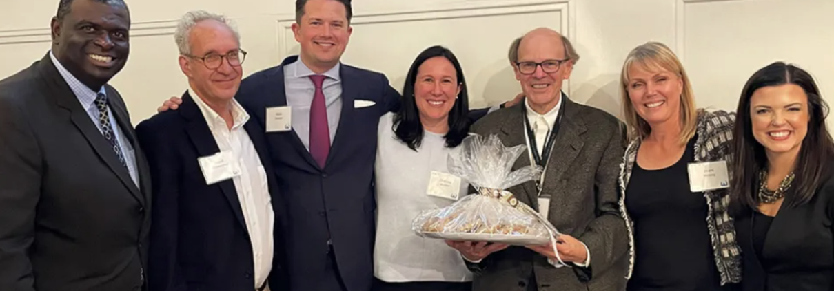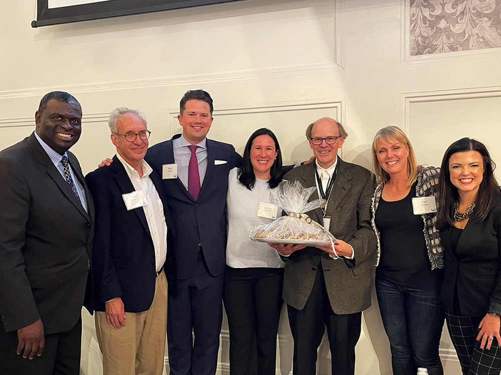 September 26, 2022. George’s chocolate chip cookies were auctioned again this year at Division of Indian Work’s annual LEAP fundraiser. The winning bids (by two bidders) were $4,000! Soule & Stull was a proud sponsor of DIW’s LEAP event, celebrating 70 years of DIW. DIW’s mission is “to support and strengthen urban American Indian people through culturally-based education, traditional healing approaches, and leadership development.” Hundreds of people attended the event to support DIW’s programs. George serves on the DIW Board of Directors.Photo: MC Reg Chapman; Lloyd Zimmerman, Nate & Chelsea Walcker (successful bidders); George; Joani Moberg (successful bidder); auctioneer Sarah Jean Knox